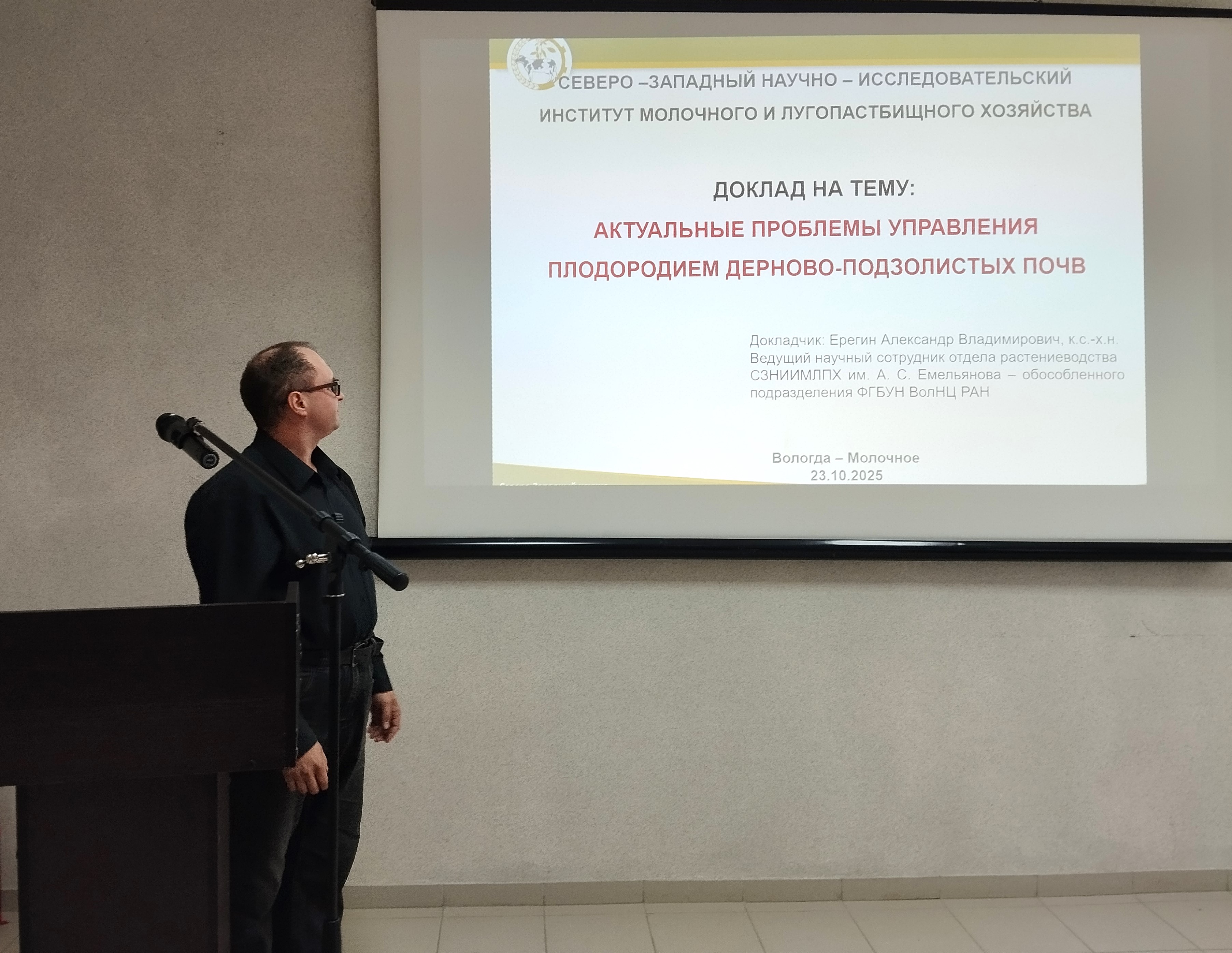 23 октября 2025 года в СЗНИИМЛПХ под руководством и.о. зав. отделом растениеводства Е.Н. Прядильщиковой проведён научный семинар-дискуссия «Актуальные проблемы управления плодородием дерново-подзолистых почв». С докладом выступил ведущий научный сотрудник отдела растениеводства к.с.-х.н. А.В. Ерегин.