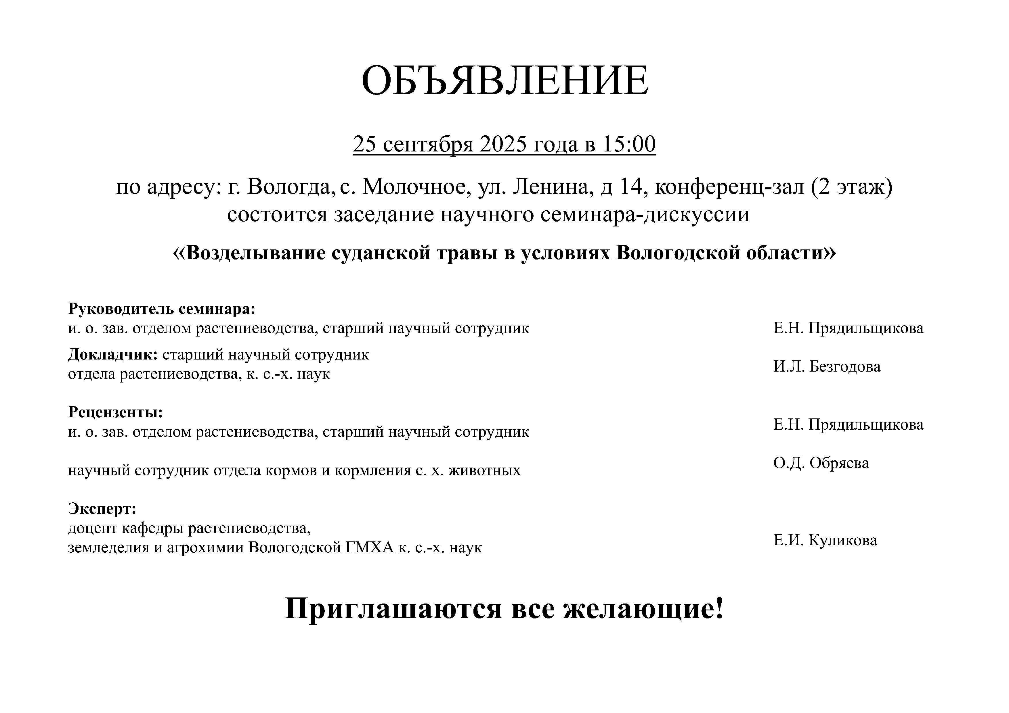 25 сентября 2025 года состоится заседание научного семинара-дискуссии «Возделывание суданской травы в условиях Вологодской области»