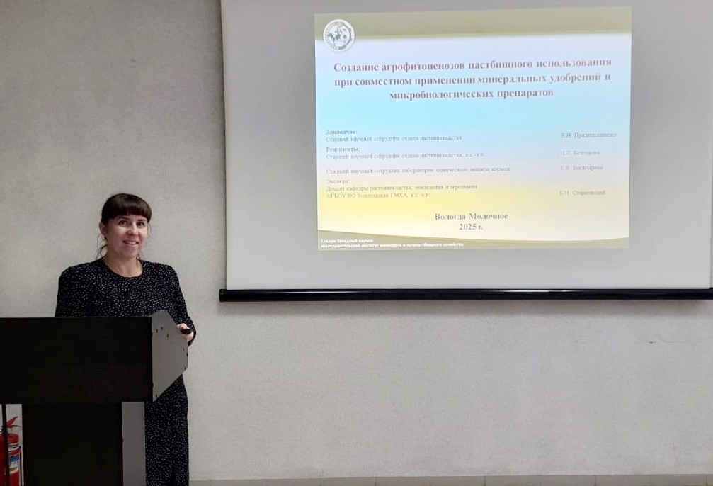 25 ноября 2025 года в СЗНИИМЛПХ под руководством ведущего научного сотрудника отдела растениеводства к.с.-х.н. В.В. Вахрушевой проведён научный семинар-дискуссия «Создание агрофитоценозов пастбищного использования при совместном применении минеральных удобрений и микробиологических препаратов». С докладом выступила старший научный сотрудник, и.о. зав. отделом растениеводства Е.Н. Прядильщикова.