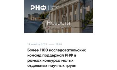 29 ноября 2025 года Российский научный фонд подвел итоги отбора проектов на получение грантов по конкурсу «Проведение фундаментальных научных исследований и поисковых научных исследований малыми отдельными научными группами». В Вологодской области поддержку Российского научного фонда в данном конкурсе получили только 3 проекта, два из них сотрудников Вологодского научного центра РАН: «Культура ответственности предпринимательства как фактор устойчивости региона» под руководством зам. директора по научной работе, г.н.с. д.э.н., профессора Т.В. Усковой, «Модернизация малых городов России на основе активизации межмуниципальных социально-экономических связей» под руководством зав. центром, в.н.с. к.э.н. С.А. Кожевникова.