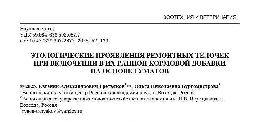По результатам исследований в журнале белого списка «Пермский аграрный вестник» № 4 (52) за 2025 год опубликована статья «Этологические проявления ремонтных телочек при включении в их рацион кормовой добавки на основе гуматов», авторами которой являются ведущий научный сотрудник технологического отдела СЗНИИМЛПХ к.с.-х.н. доцент Е.А. Третьяков и доцент кафедры зоотехнии и биологии Вологодской ГМХА к.с.-х.н. доцент О.Н. Бургомистрова.