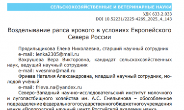 В научной работе приведены результаты исследований, проведённых в 2024 году, на опытном поле СЗНИИМЛПХ в Вологодской области. Наибольшая урожайность семян 2,54 т/га получена у гибрида Миракль. Содержание протеина в семенах изучаемых гибридов и сорта варьировалось от 22,5% до 27,1%, жира – от 36,2 до 38,9%.