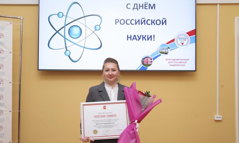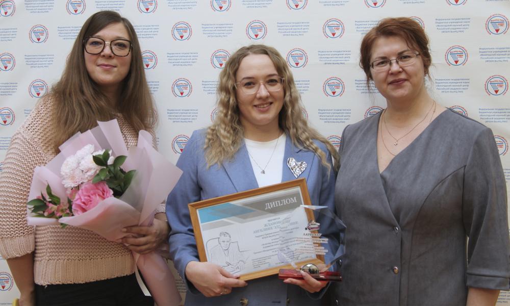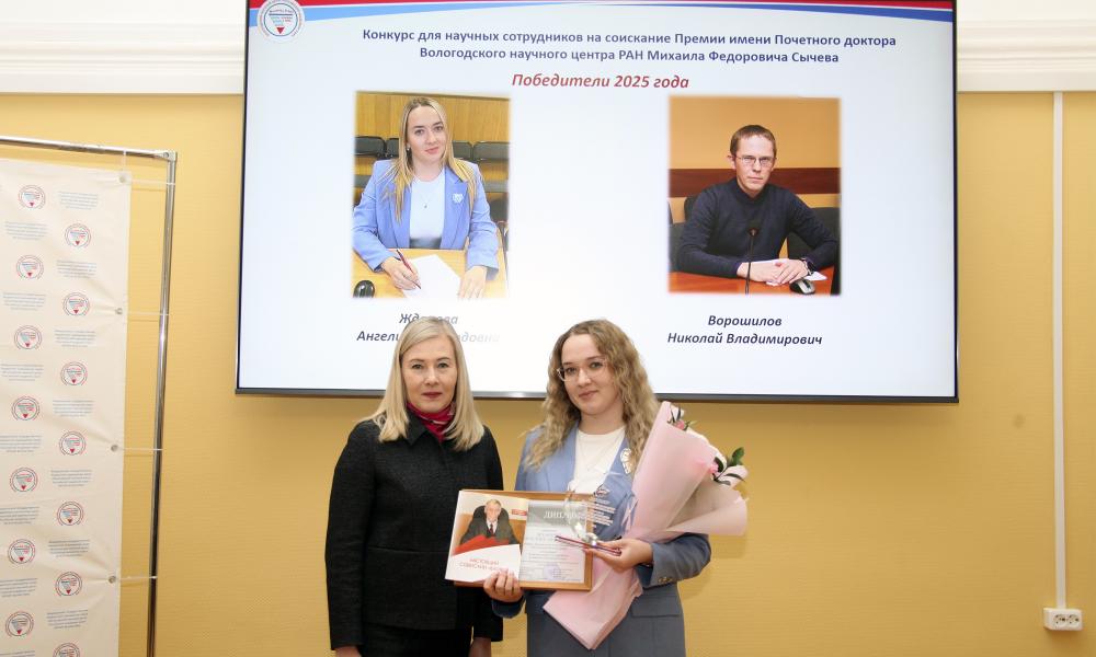 Первый заместитель директора к.э.н. Л.В. Бабич вручила награды победителям премии им. Почетного доктора ВолНЦ РАН М.Ф. Сычева, цель которой – стимулирование научно-исследовательской деятельности молодых ученых ФГБУН ВолНЦ РАН. С 2022 года премия присуждается за научные исследования, содержащие значимые научные результаты в области экономики, социологии, сельского хозяйства. В этом году победителями стали: