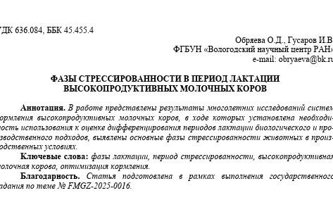 Исследование проведено на поголовье коров голштинской породы на привязном способе содержания в сельскохозяйственном предприятии Вологодской области.
