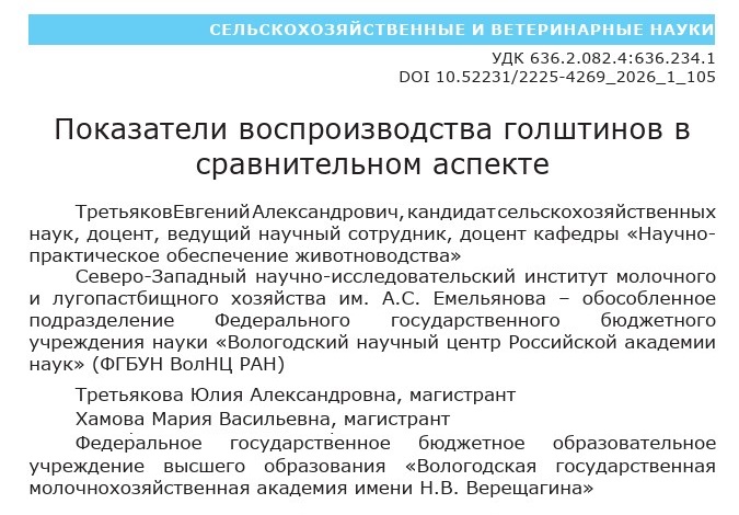 Исследования проведены в рамках темы государственного задания № FMGZ-2025-0016, в рамках которых осуществлён сравнительный анализ динамики основных репродуктивных показателей крупного рогатого скота голштинской породы, охватывающий временной промежуток с 2019 по 2023 год. Объектами для сопоставления выступили три уровня: Российская Федерация в целом, Северо-Западный федеральный округ (СЗФО) и Вологодская область. Информационной базой для работы послужили статистические данные, опубликованные в ежегодных сборниках по племенной работе. В ходе анализа рассматривались ключевые критерии эффективности воспроизводства: возраст животных при первом отёле, продолжительность сервис-периода и показатель выхода телят в расчёте на 100 коров. Результаты исследования демонстрируют, что на общероссийском уровне прослеживается устойчивая тенденция к улучшению воспроизводительных качеств стада. Зафиксировано последовательное снижение возраста первого отёла с 741 до 731 дня. Отмечено стабильное сокращение длительности сервис-периода, который к 2023 году уменьшился на 9 дней, достигнув отметки в 123 дня, что в целом указывает на нормализацию репродуктивных процессов в масштабах страны. Анализ ситуации в Северо-Западном федеральном округе выявил значительную положительную динамику по ряду направлений: продолжительность сервис-периода сократилась на 14 дней, составив к концу изучаемого периода 120 дней. С возрастом первого отёла наблюдается неоднозначная ситуация: несмотря на то, что в 2020 году был зафиксирован рекордно низкий показатель (716 дней), к окончанию анализируемого периода значение этого параметра в СЗФО стало самым высоким среди всех сравниваемых объектов, достигнув 737 дней. Вологодская область демонстрирует нестабильную динамику. При рекордных значениях в 2021 году возраста первого отёла (686 дней) и сервис-периода (112 дней), достигнутых в отдельные годы, к 2023 г. Оба показателя ухудшились, приблизившись к среднероссийскому уровню. Наиболее тревожная тенденция выявлена по выходу телят на 100 коров: будучи лидером в 2019 г. (92,8%), область к 2023 г. Снизила показатель до 82,6%, потеряв за пять лет 10,2%. При этом РФ и СЗФО демонстрируют устойчивый рост данного показателя, стабильно превышая норматив Минсельхоза (80%). Выявленные региональные различия указывают на необходимость углублённого анализа причин ухудшения воспроизводительных качеств коров в Вологодской области, включая возможные технологические, ветеринарные и организационные факторы.