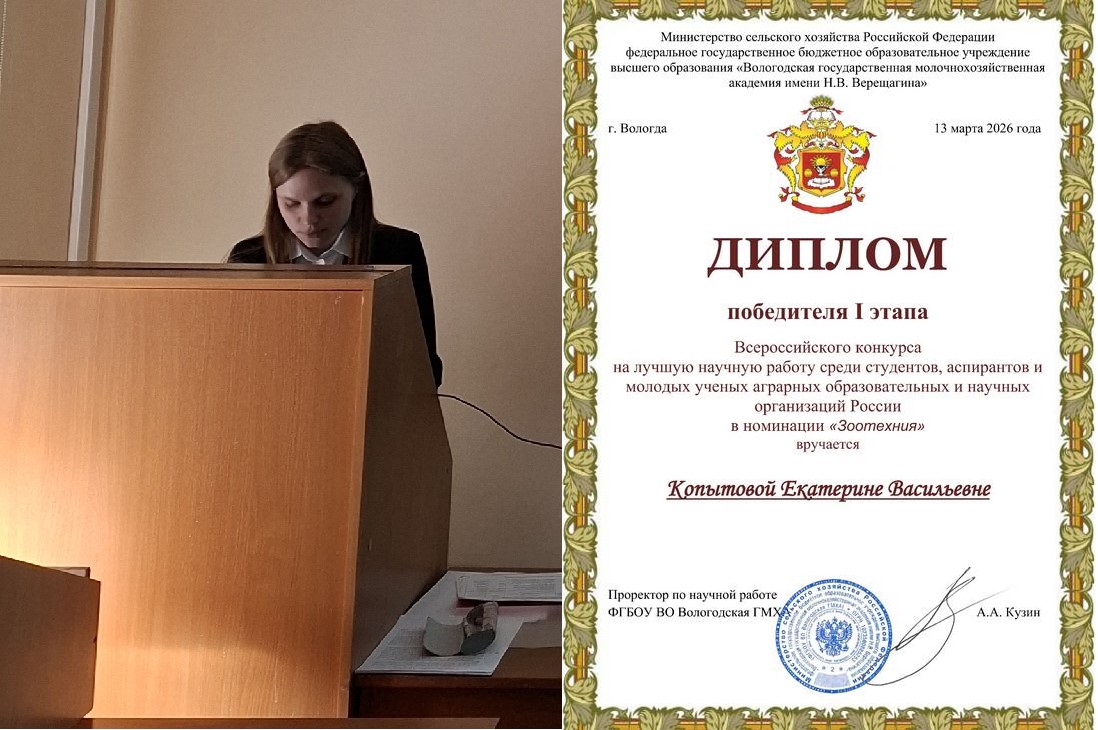Базовую кафедру «Научно-практическое обеспечение животноводства» в номинации «Зоотехния» представила магистрант 2 курса Копытова Екатерина Васильевна (научный руководитель к.с.-х.н. доцент Е.А. Третьяков) с научной работой на тему «Обоснование дальнейшего использования яичных кроссов Ломан Браун Классик и Ломан ЛСЛ Классик в условиях ООО «РУСАГРООБЪЕДИНЕНИЕ» Вологодской области».