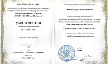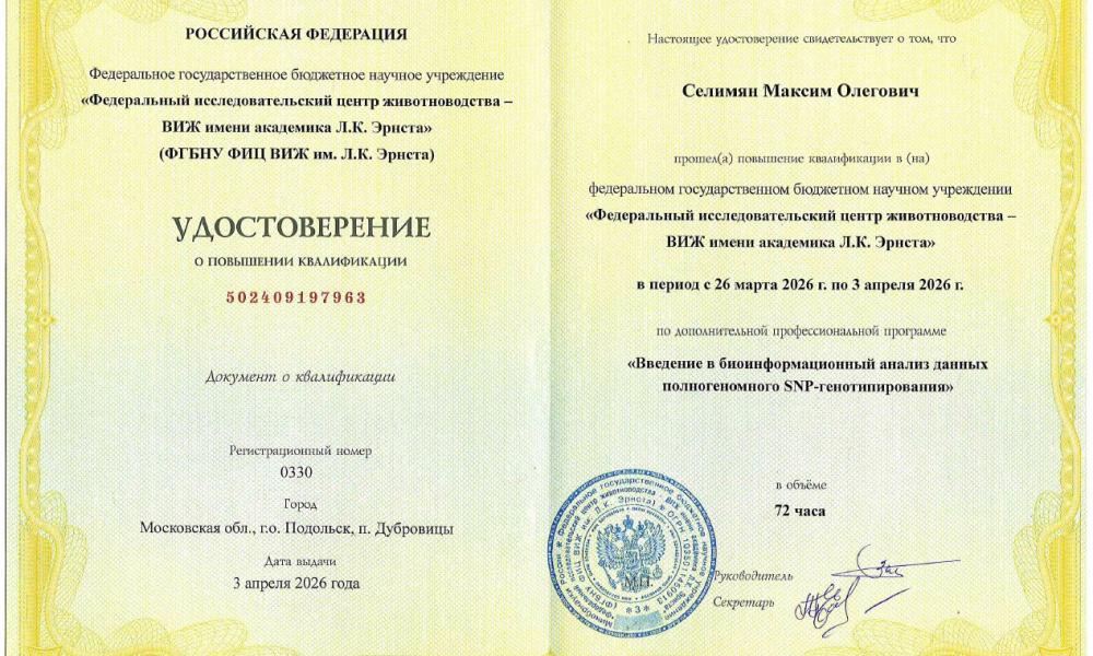 По итогам обучения сотрудникам выданы удостоверения: Селимяну М.О. по программе «Введение в биоинформационный анализ данных полногеномного SNP-генотипирования», Ивановой Д.А. по программе «ДНК-технологии в животноводстве».